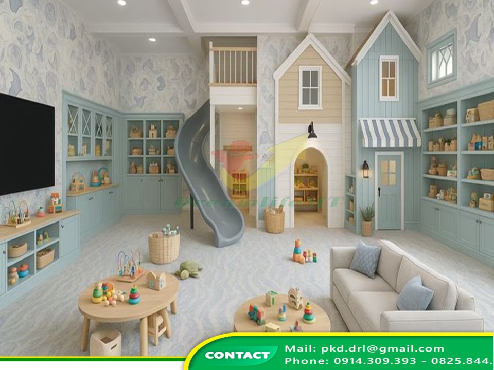 – Ánh Sáng: Ánh sáng tự nhiên rất quan trọng. Nếu có thể, nên thiết kế các cửa sổ lớn để tận dụng ánh sáng tự nhiên. Điều này không chỉ tốt cho sức khỏe mà còn giúp trẻ cảm thấy thoải mái hơn trong không gian vui chơi.